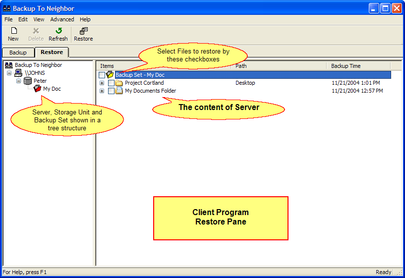 User may browse the real-time content of server from Client Program. Then, the user may select the files to restore by the checkboxes.