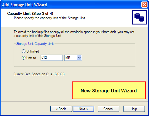 Wizard helps user to create Storage Unit. A capacity limit can be specified to avoid backup files occupy too much hard disk space on server.