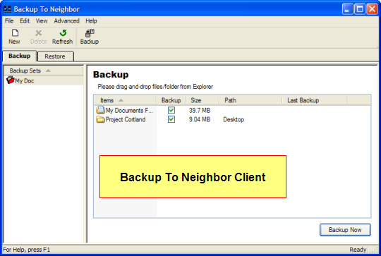 Backup To Neighbor can be configured to many different scenarios. For example, Dedicated Server, Peer-to-Peer, Rotational Backup, working within a LAN or across WAN.